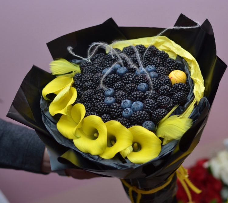 Ingredients: blackberries, blueberries, yellow mini calla lilies, chocolate